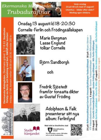 Gustaf Fröding-, Ferlin- och Cornelissällskapet bjuder in till trubadurkväll på Ekermanska malmgården i Tantolunden. Medverkande: Björn Sandborgh och Fredrik Sjöstedt (Fröding), Adolphson & Falk (Ferlin) och Marie Bergman (Cornelis).